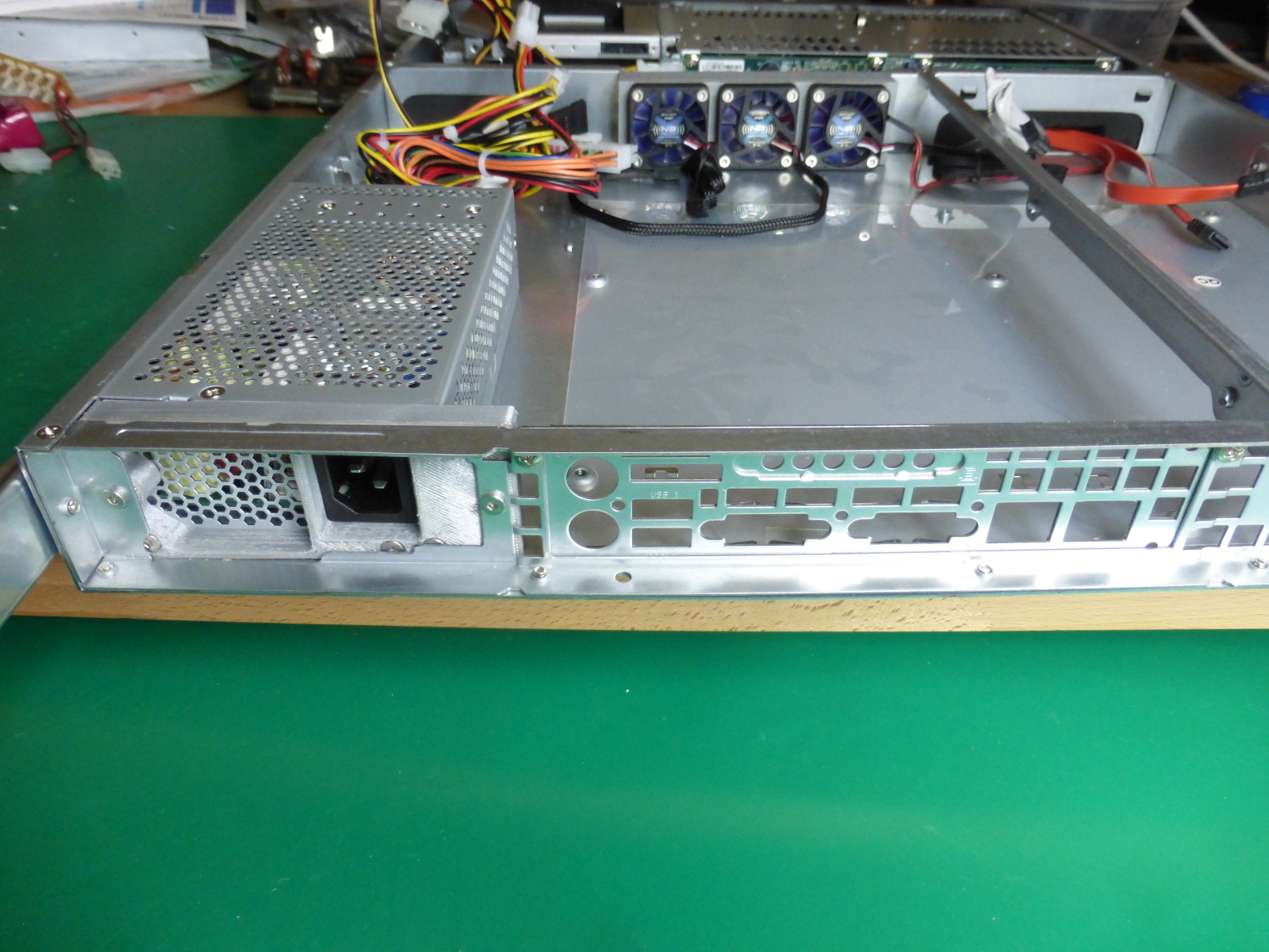 Umbau eines SuperMicro 1HE Gehäuses zum flüsterleisen Niedrigenergie Applikationserver.Einbau der flüsterleisen 40mm Lüfter und des lüfterlosen Netzteils
